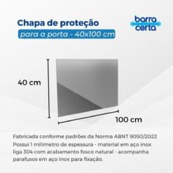 A instalação pode ser feita com cola de contato ou parafusos. O ideal é que a chapa seja colocada com os parafusos e não colada, assim não corre o risco de ir se soltando durante o tempo. Nós fornecemos os 4 parafusos de aço inox para fixação. O material da chapa é aço inox com 1,0 mm de espessura, portanto não enferruja. Atende a norma da ABNT 9050, a saber lei nacional de acessibilidade. Para que a porta seja totalmente adaptada é obrigatório a instalação também da barra de apoio para porta na medida de 40 cm que serve como puxador e auxilia o usuário na abertura da porta.