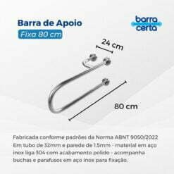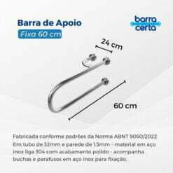 A barra fixa para vaso sanitário é fabricada com tubo de aço inox liga 304 polido. O diâmetro do tubo é de 32 mm e a parede do tubo é de 1,5 mm. É resistente à ação do vapor da água quente, assim sendo, evita o surgimento de ferrugem. A barra suporta um peso até 180 kilos. A barra fixa deve ser instalada a uma altura de 75 cm, medindo do piso acabado. O comprimento da barra da parede até o final da barra é de 60 cm ou 70 cm ou 80 cm.